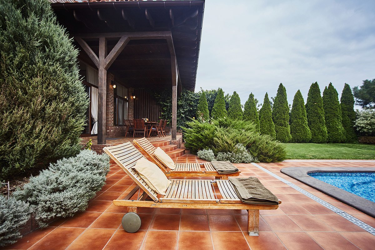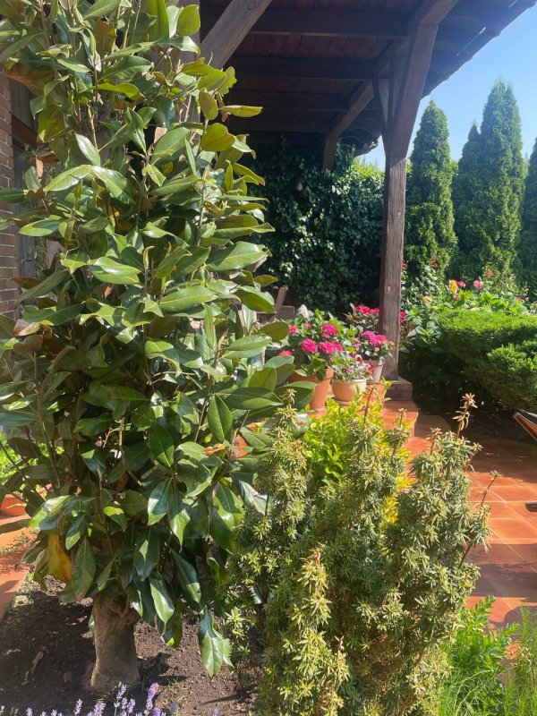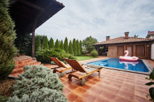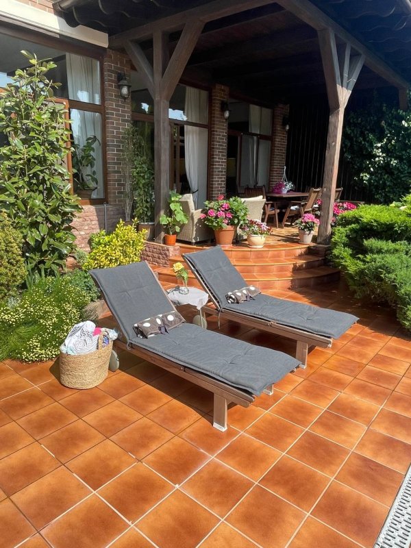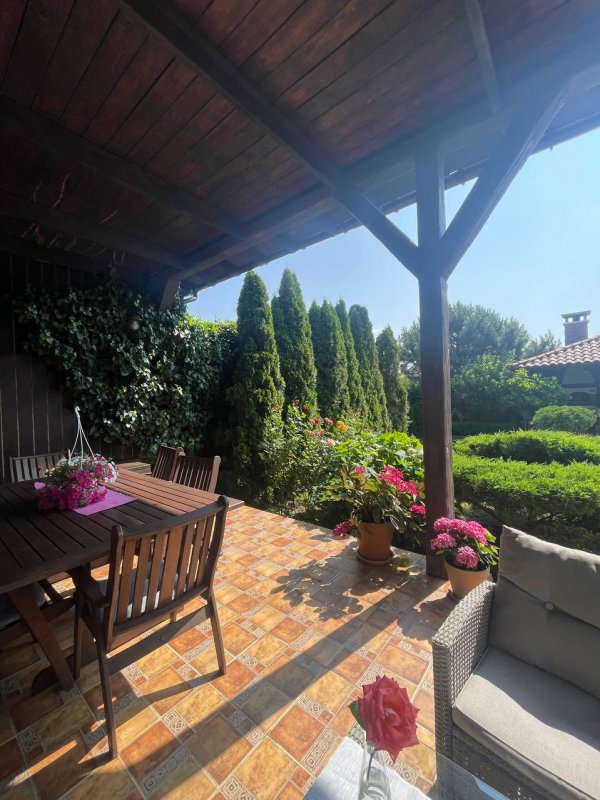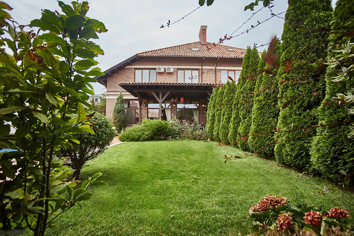 Небольшой участок (5 соток) с отдельной летней кухней, беседкой, барбекю, печью на дровах, гаражом и красивым ландшафтом с зелёной лужайкой.