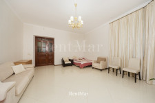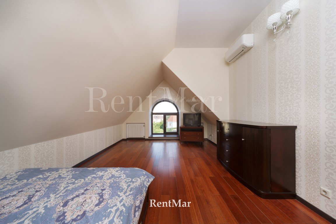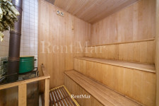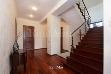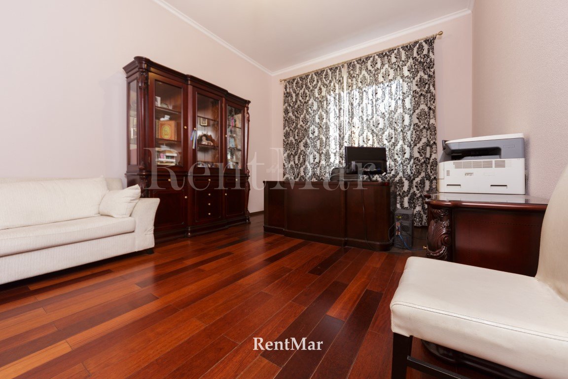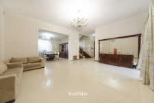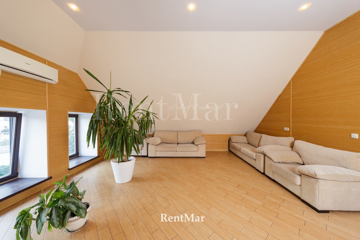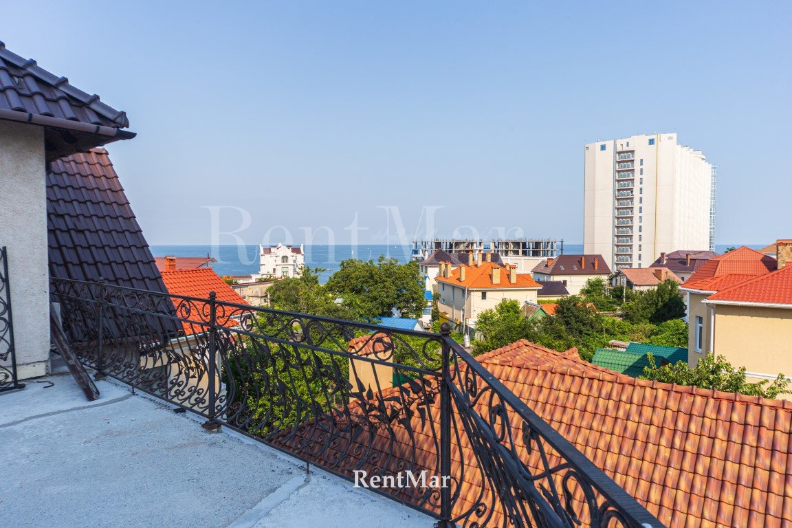 Три этажа, просторные раздельные комнаты, из всех окон 2-го и 3-го этажа открывается вид на море. В доме есть баня, гараж на два автомобиля. В нижнем уровне есть возможность оборудовать спортзал. На первом этаже высота потолков составляет 4 м, на последующих - 3 м. На каждом этаже санузлы. Во всем доме деревянный паркет. Есть открытая терраса с видом на море и Аркадию.