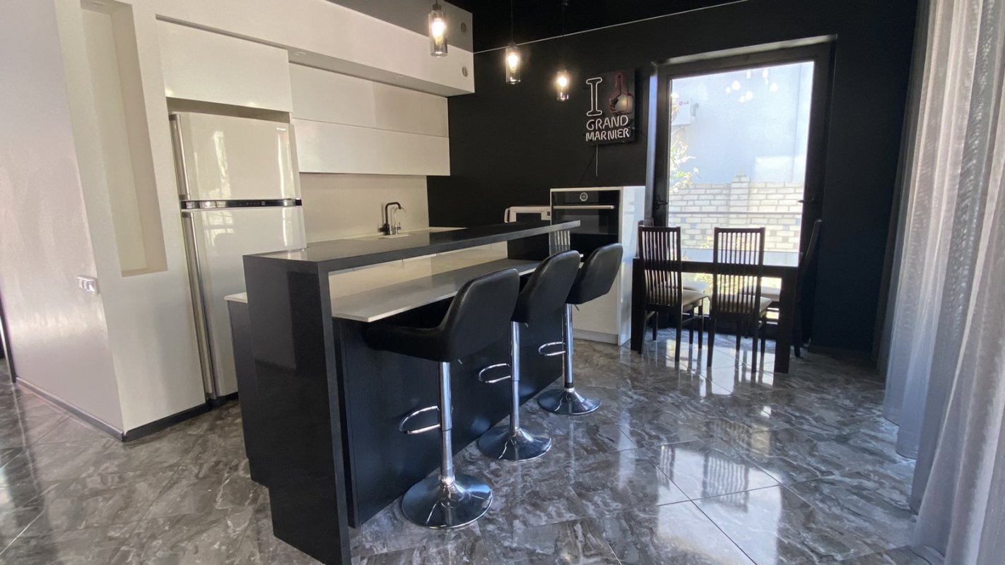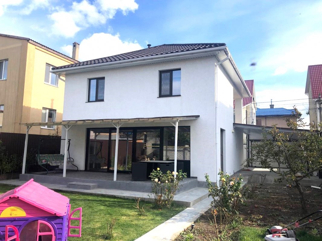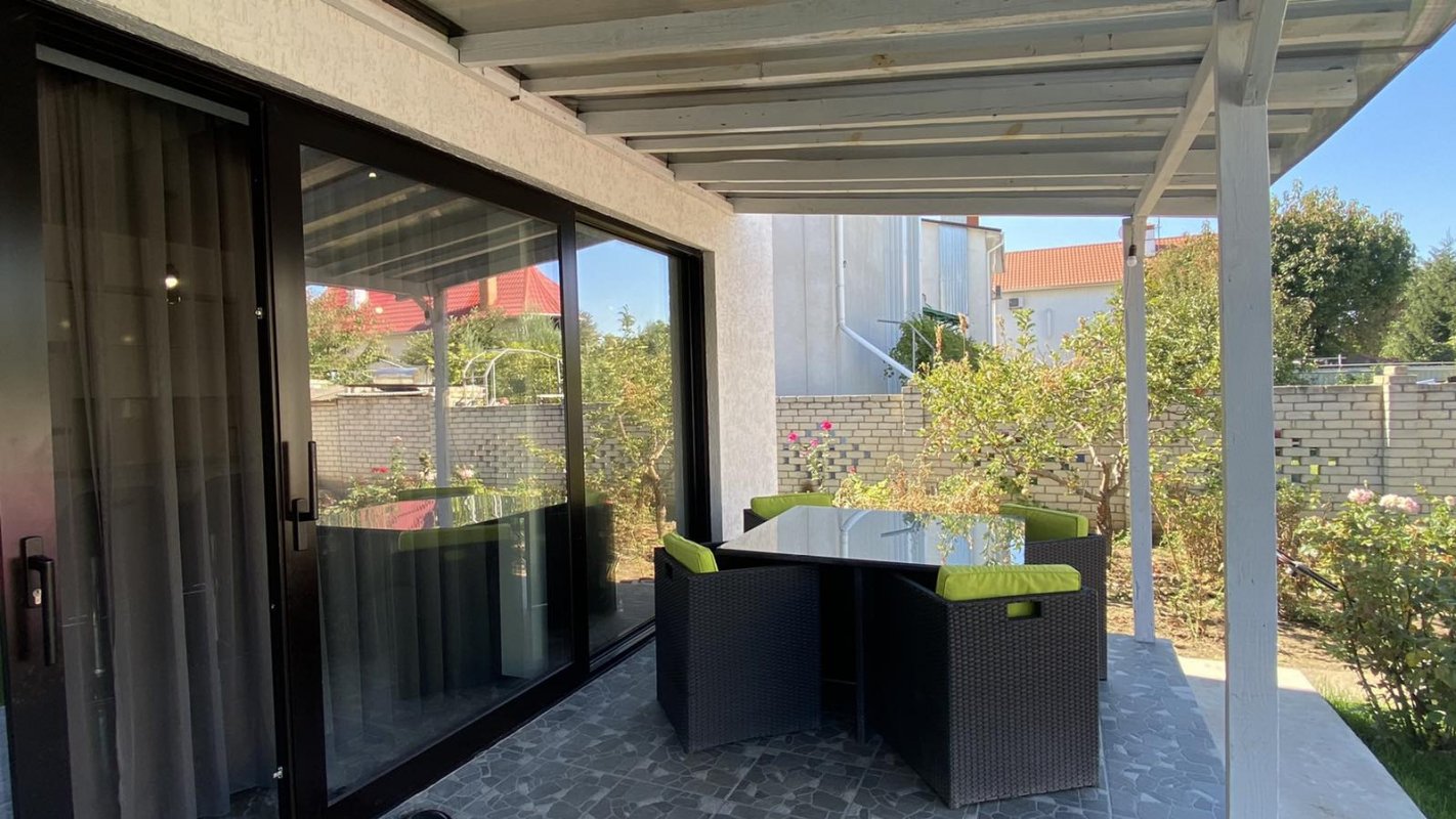 07385 Аренда нового стильного дома в Черноморке, закрытый охраняемый кооператив Луч. Площадь 120 кв. м., в доме 3 отдельные спальни, и гостиная-кухня-студия, духовка, телевизор, стиральная машина, посудомойка, 2 санузла (душевая+ ванная), автономное отопление, тёплый пол, роскошная терраса с мебелью. Красивый участок 4 сотки. Место для машины под навесом. 1 минута к морю.