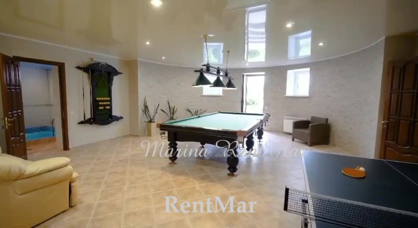 Цокольный этаж: большой игровой зал, теннис, бильярд, бассейн с подогревом воды, финская сауна и комната отдыха, санузел.