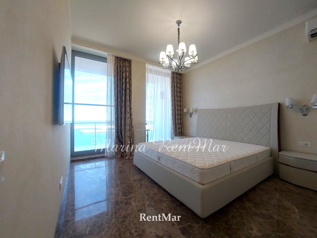 3-х ком апартаменты с террасой и великолепным видом на море! Совиньон, 1-я линия, рядом Яхт - Клуб Общ пл - 127 кв м Кухня-гостиная -студия, отдельно 2 спальни (одна детская) большой с/у, 2 гардеробные. Дорогой высококачественный ремонт-делали для себя! Мраморные полы с подогревом, немецкая техника Siemens, итальянская мебель, балкон с садовой мебелью, кондиционеры в каждой комнате