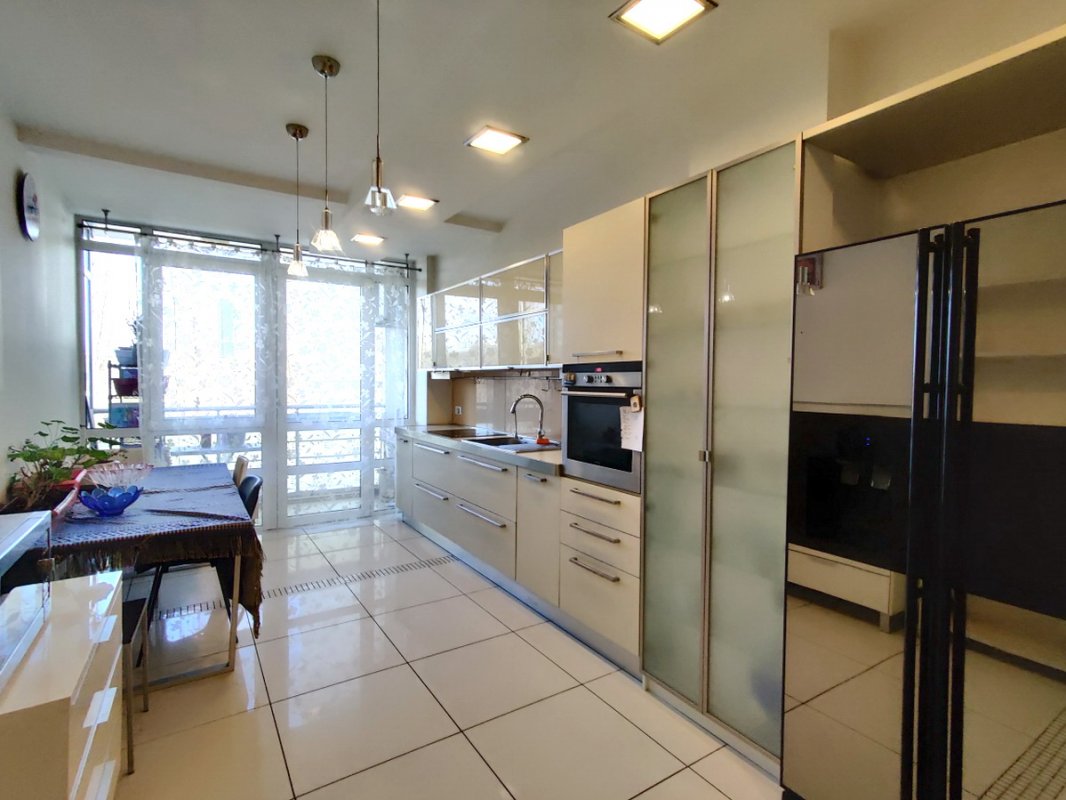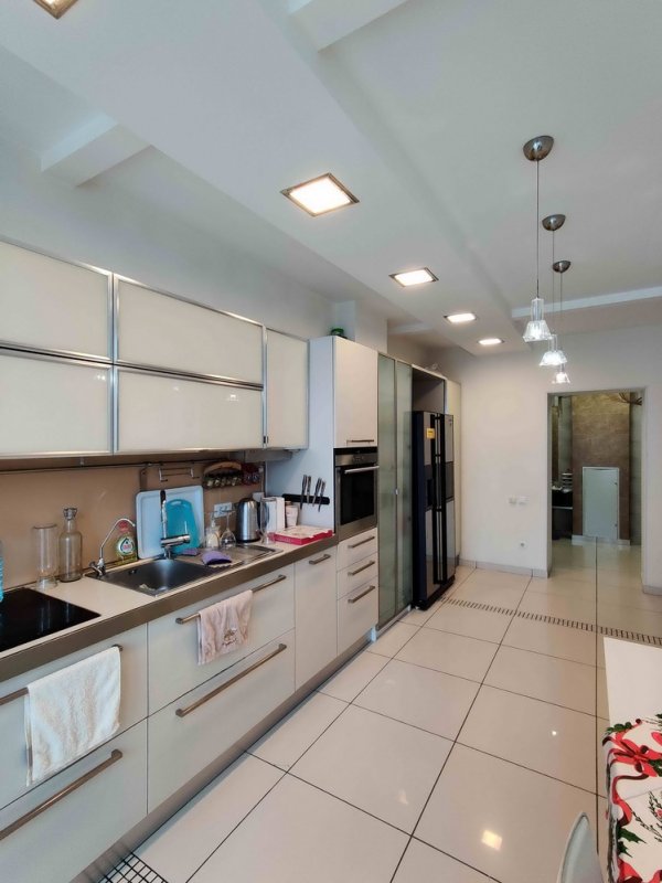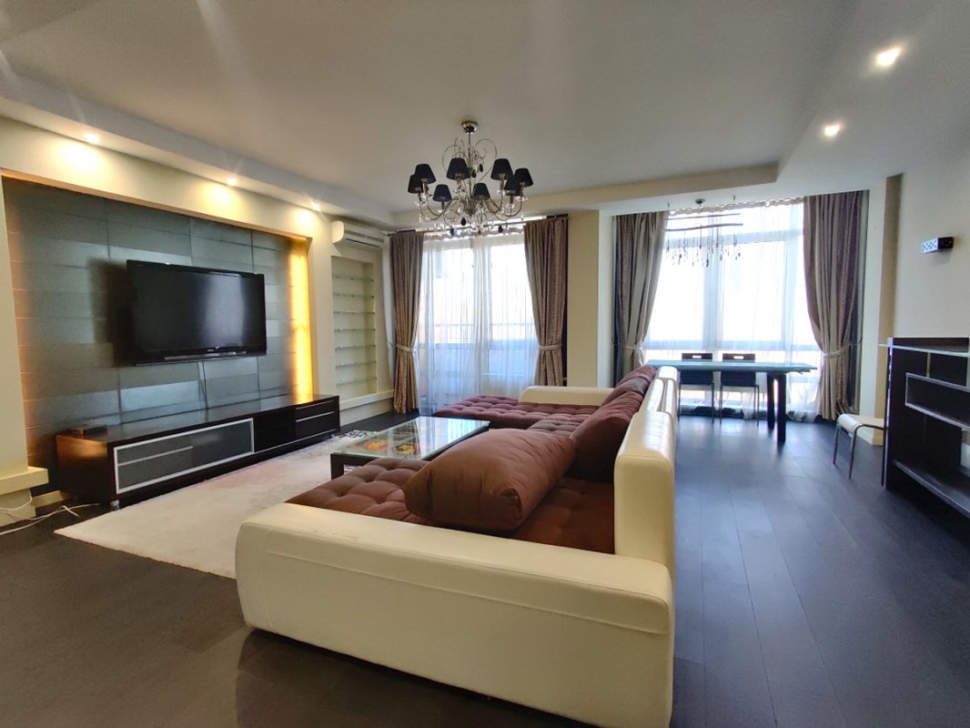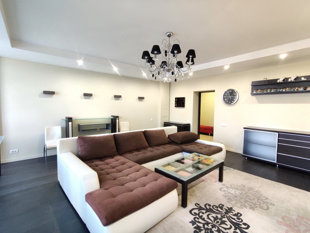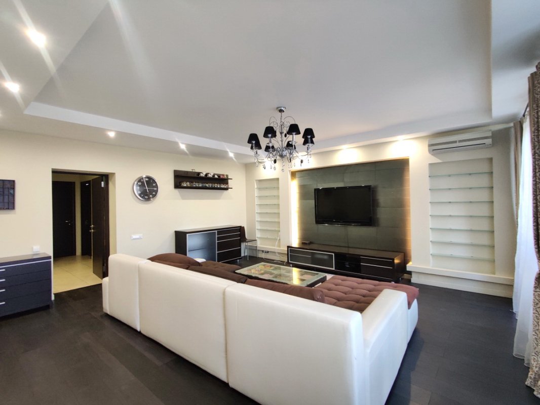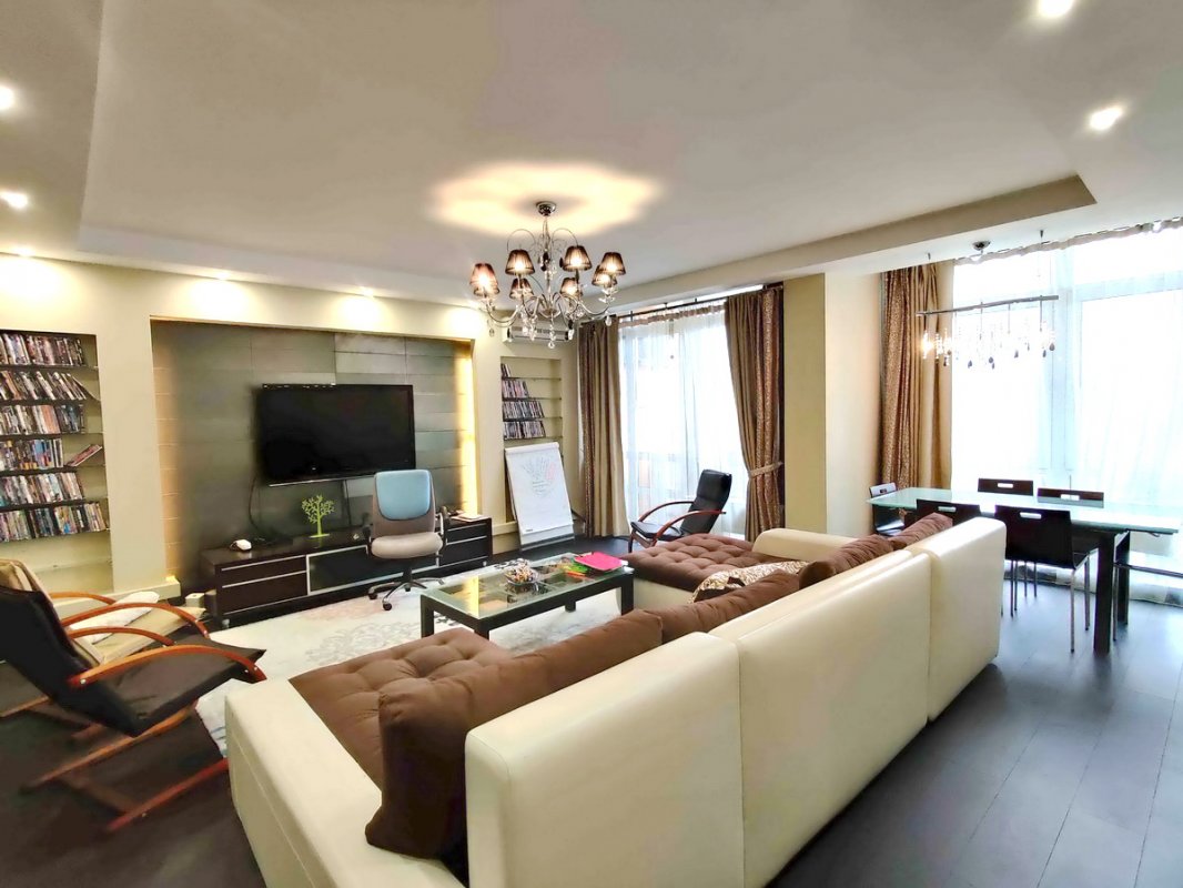 162 кв. м., 4 отдельные комнаты (3 спальни и кабинет), гостиная 37 кв. м., отдельная кухня-столовая, 2 санузла, 4 балкона.